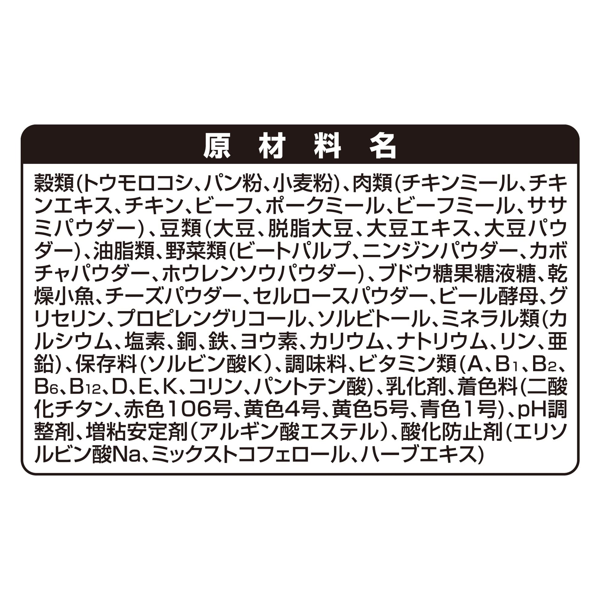 穀類(トウモロコシ、パン粉、小麦粉)、肉類(チキンミール、チキンエキス、チキン、ビーフ、ポークミール、ビーフミール、ササミパウダー)、豆類(大豆、大豆タンパク、脱脂大豆、大豆エキス、大豆パウダー)、動物性油脂、野菜類(ビートパルプ、ニンジンパウダー、カボチャパウダー、ホウレンソウパウダー)、ブドウ糖果糖液糖、乾燥小魚、チーズパウダー、セルロースパウダー、ビール酵母、グリセリン、プロピレングリコール、ミネラル類(カルシウム、塩素、銅、鉄、ヨウ素、カリウム、ナトリウム、リン、セレン、亜鉛)、ソルビトール、保存料(ソルビン酸K)、調味料、ビタミン類(A、B1、B2、B6、B12、D、E、K、コリン、パントテン酸、葉酸)、乳化剤、着色料(二酸化チタン、赤色106号、黄色4号、黄色5号、青色1号)、pH調整剤、増粘安定剤(アルギン酸エステル)、酸化防止剤(エリソルビン酸Na、ミックストコフェロール、ハーブエキス)